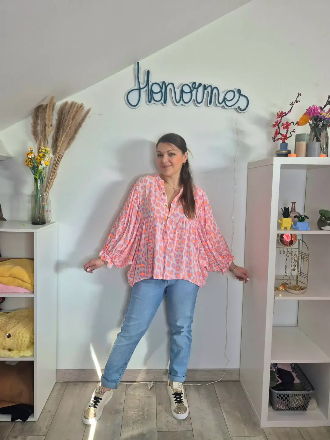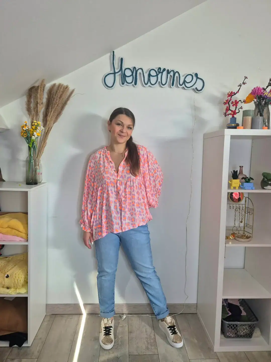 Sa coupe large et fluide est spécialement conçue pour les femmes grande taille : elle épouse les formes sans les marquer, assurant confort et légèreté. L’imprimé léopard fluo, à la fois original et ultra-tendance, dynamise instantanément votre tenue et attire tous les regards.