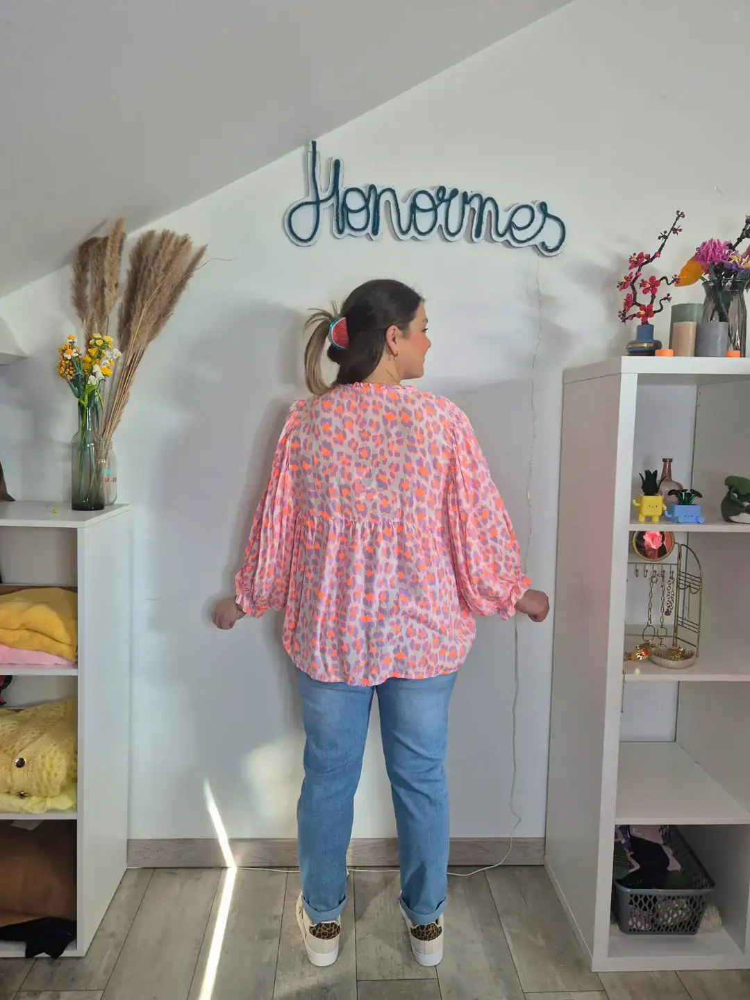 Apportez une touche audacieuse et tendance à votre dressing avec cette blouse grande taille à imprimé léopard fluo. Pensée pour sublimer toutes les silhouettes, cette pièce associe confort absolu et style affirmé.