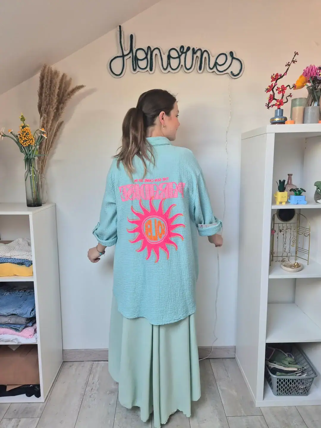 Son imprimé soleil rose fluo au niveau de la poitrine apporte une note originale et moderne, tandis que le grand motif soleil dans le dos crée un effet visuel fort et unique. Une pièce parfaite pour celles qui aiment se démarquer avec élégance.
