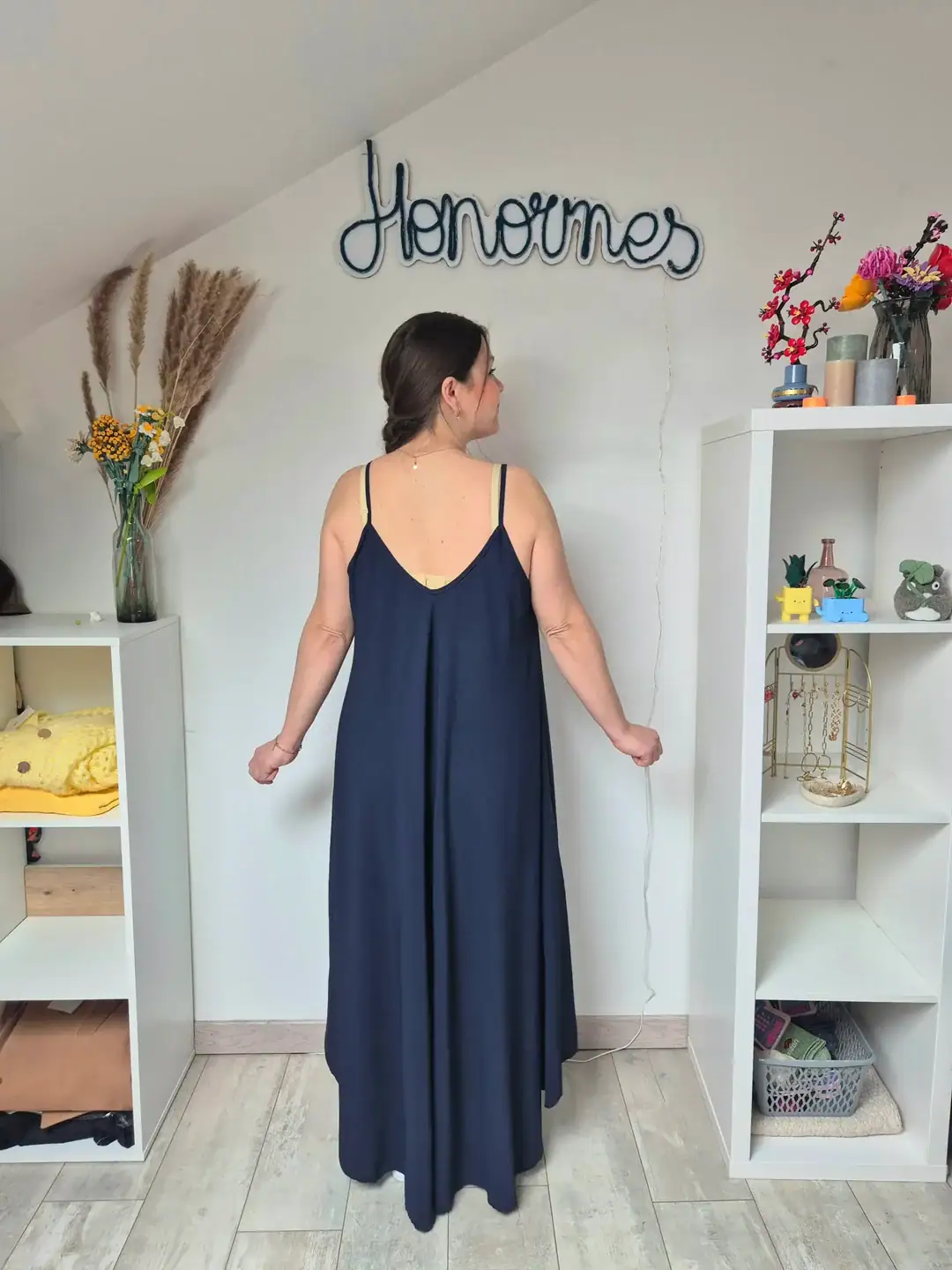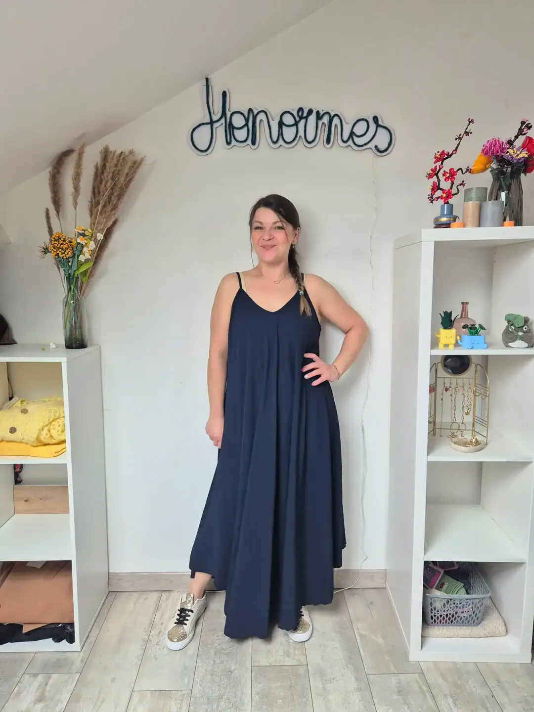 Découvrez la robe longue femme grande taille coloris marine, idéale pour allier élégance et confort. Sa coupe trapèze large et volumineuse offre une liberté de mouvement maximale et un style raffiné. Les bretelles fines apportent légèreté et féminité, tandis que le coloris marine assure un look chic et polyvalent, facile à accessoiriser.