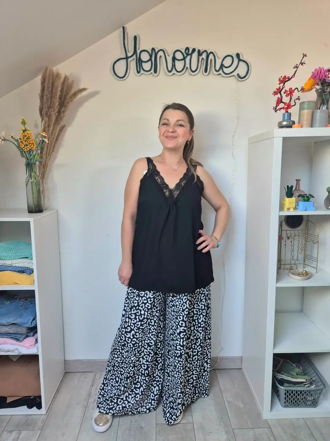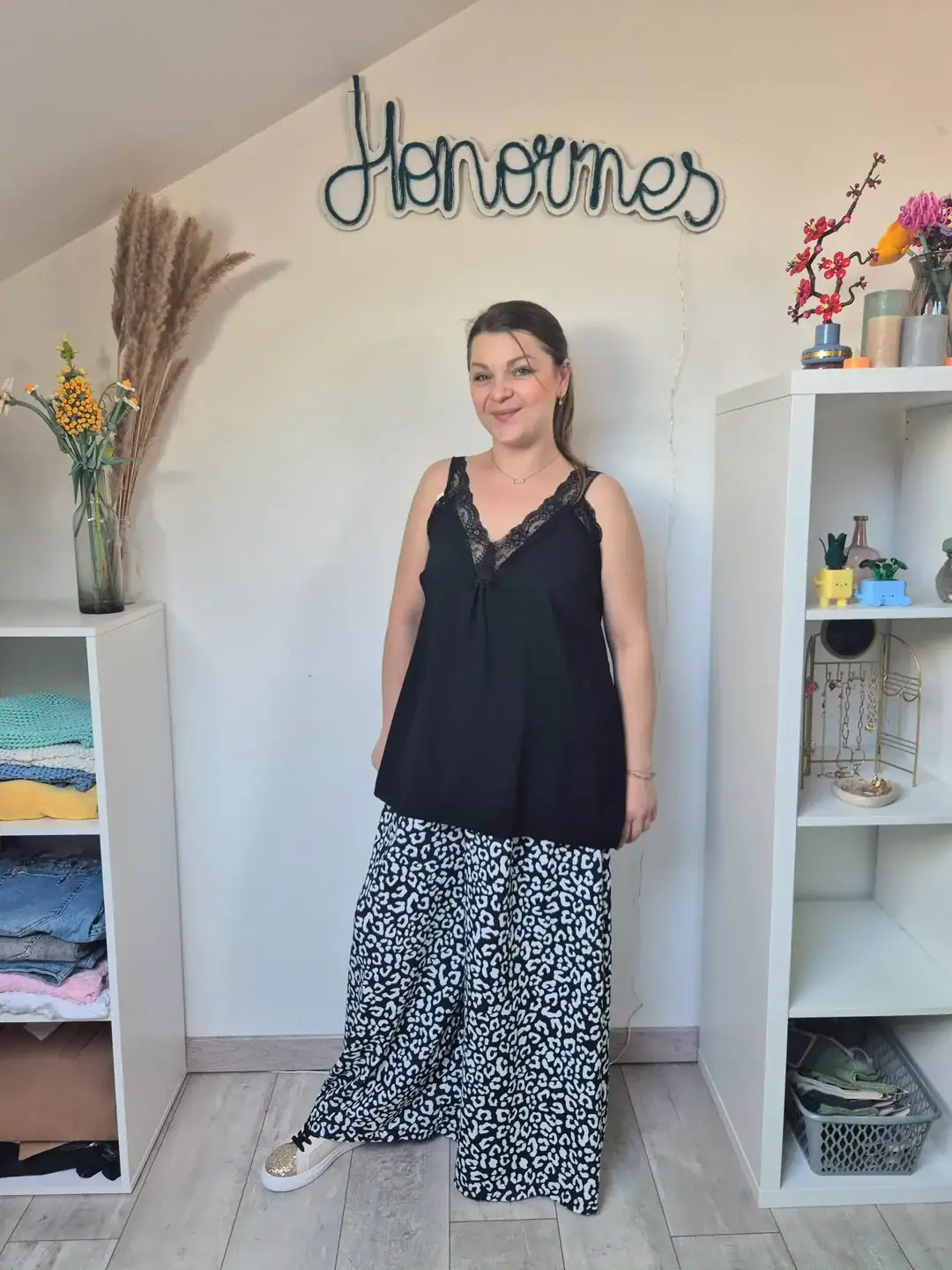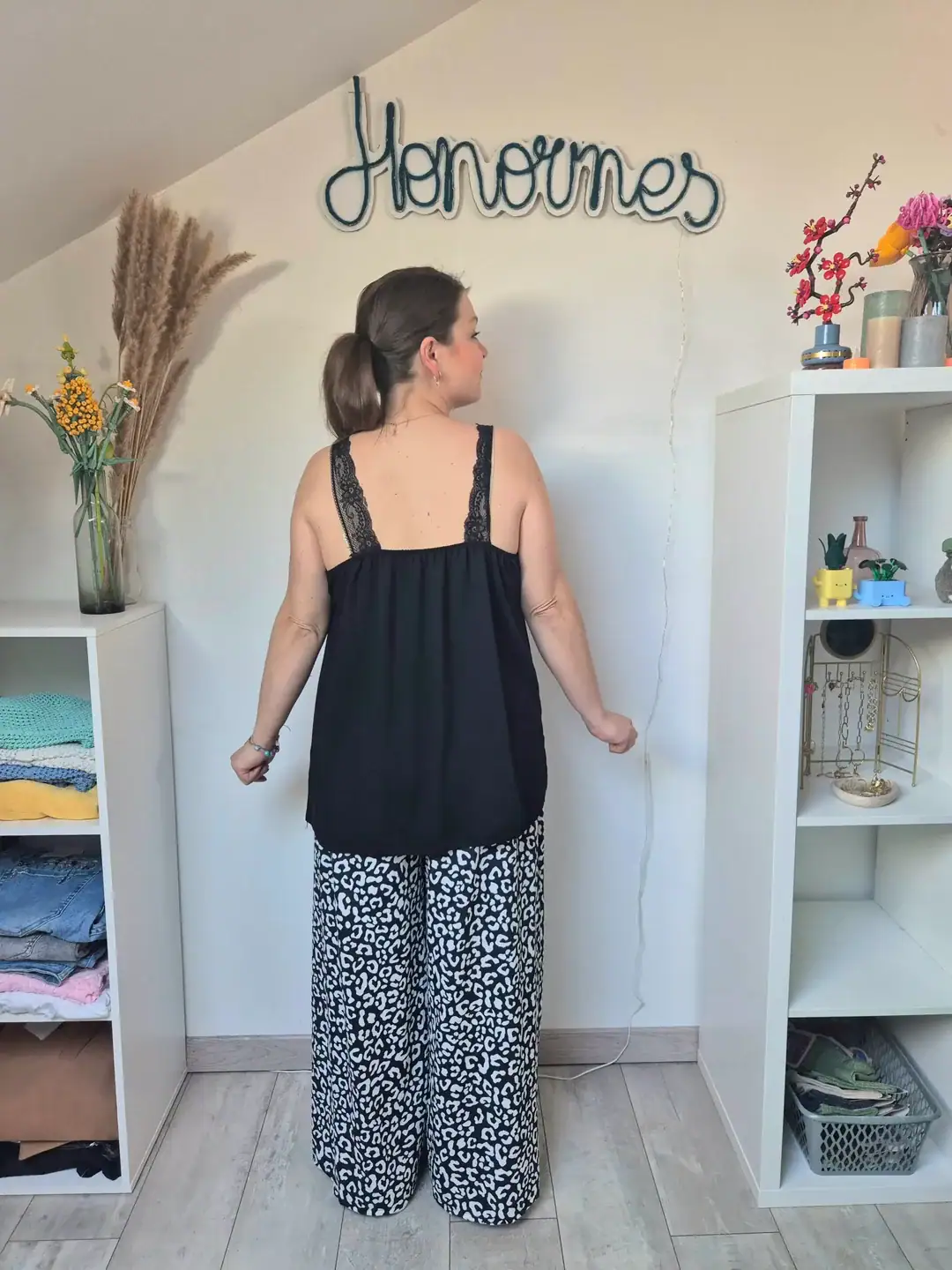Les bretelles fines et l’encolure en dentelle délicate apportent une touche romantique et raffinée, idéale pour un look casual chic ou une tenue plus habillée. Le dos élastiqué assure un maintien parfait tout en offrant une grande liberté de mouvement et un confort optimal tout au long de la journée.